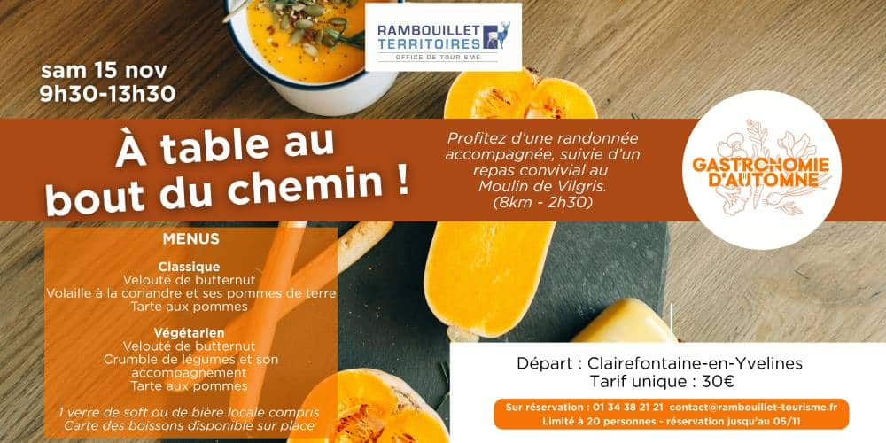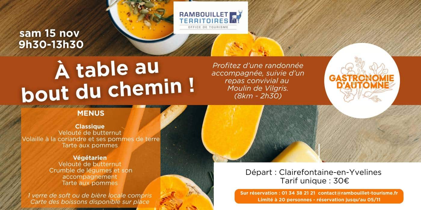Après une belle randonnée accompagnée de 8km avec Camille aux alentours de Clairefontaine-en-Yvelines, vous profiterez d'un délicieux repas aux saveurs d'automne concocté par le Moulin de Vilgris.