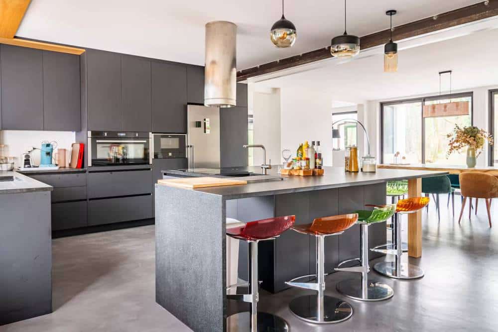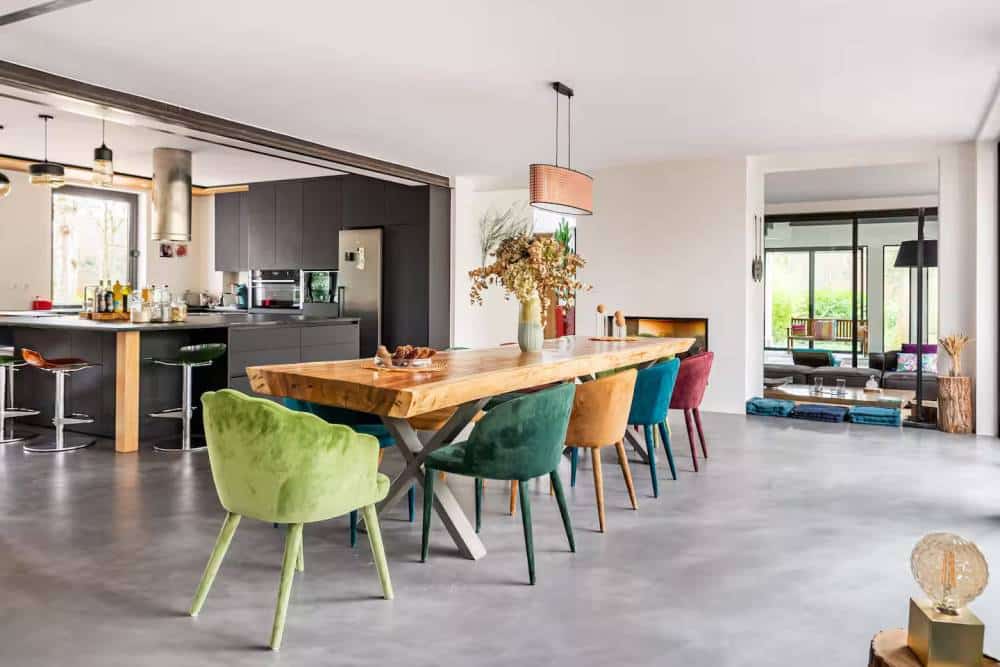 À gauche, un grand salon élégant, séparé de la salle à manger et de la cuisine par une cheminée à double foyer.