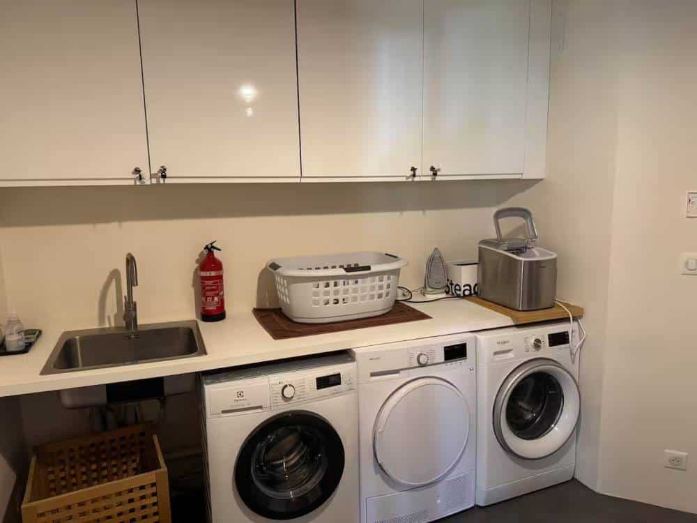 Un cellier attenant à la cuisine abrite lave-linge, sèche-linge, congélateur, frigidaire d’appoint, machine à glaçons et fer à repasser.
