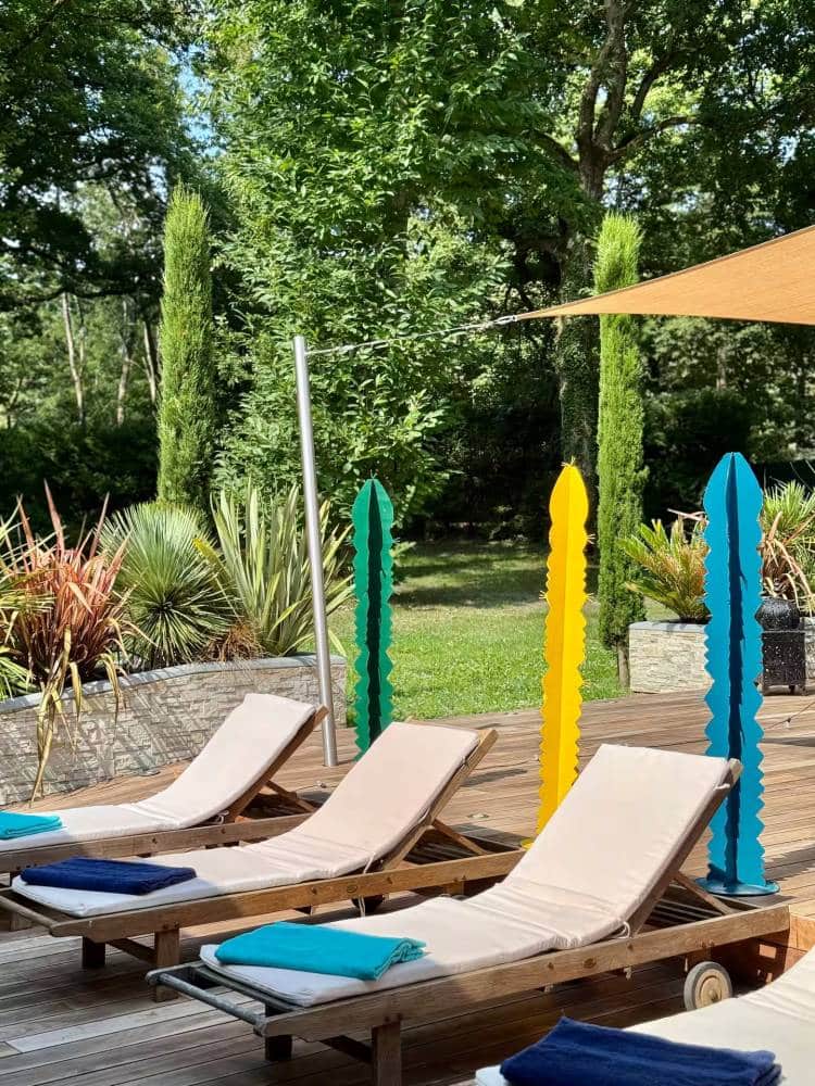 Ce vaste espace cathédrale s’ouvre sur une magnifique terrasse en bois exotique, idéale pour se reposer au soleil ou profiter d’instants de calme sur les transats.
