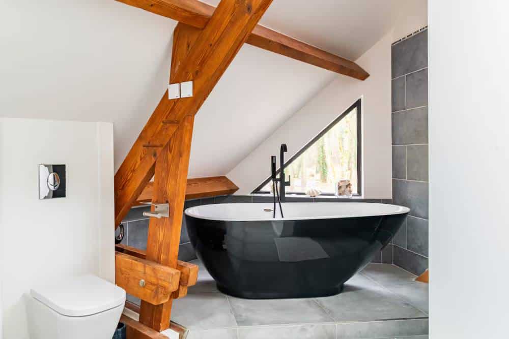 - Chambre 2 spacieuse de 50 m² : offre un lit king size (200 cm), un espace salon, une salle de bain avec baignoire, douche à l’italienne, deux vasques et des toilettes.