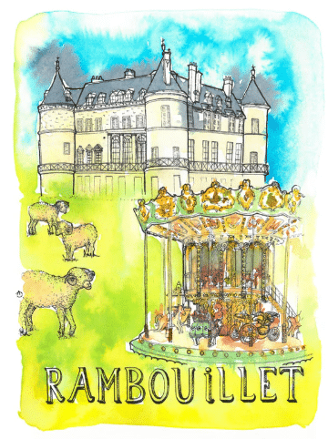 Carte postale aquarelle représentant la ville de Rambouillet (Château de Rambouillet, Carrousel, moutons Mérinos)
